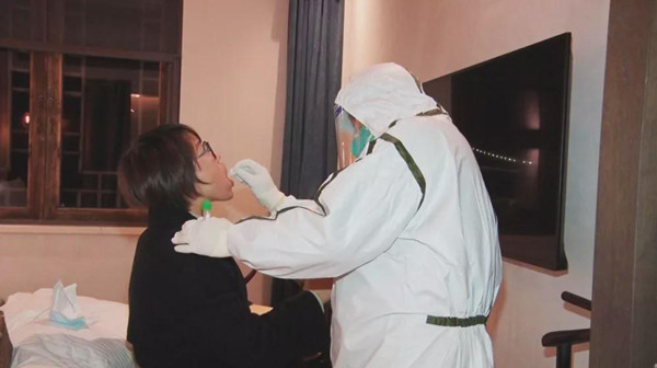 采樣過程中,受檢者在酒店隔離房間內,主動配合疾控中心工作人員進行信息記錄、核酸試紙采樣等工作。