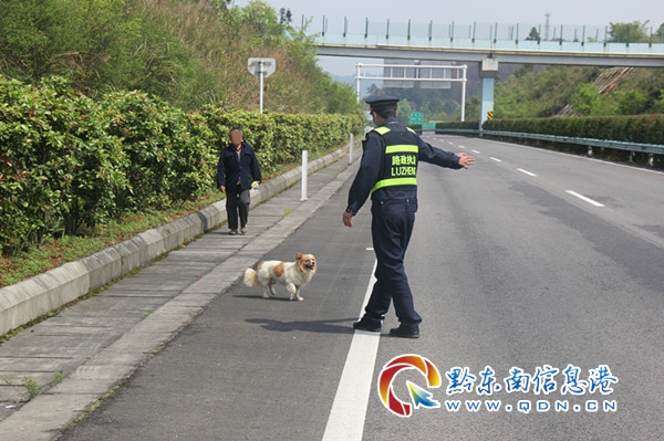 為防止意外發生,路政員立即安全停車,上前制止。路政員將小狗趕出應急車道外后,經詢問老人得知,他是準備帶著小狗到興仁鎮上購買物品,走高速公路只是為了抄近道。路政員對老人進行耐心的勸說和講解行人上高速的危險性,老人聽后表示非常慚愧并保證今后寧愿多走一些路也不會為了抄近道上高速公路了。隨后,路政員護送著老人和小狗安全離開了高速。離開時,老人朝路政員揮手說道:“謝謝你們,以后我一定不上高速公路了。”