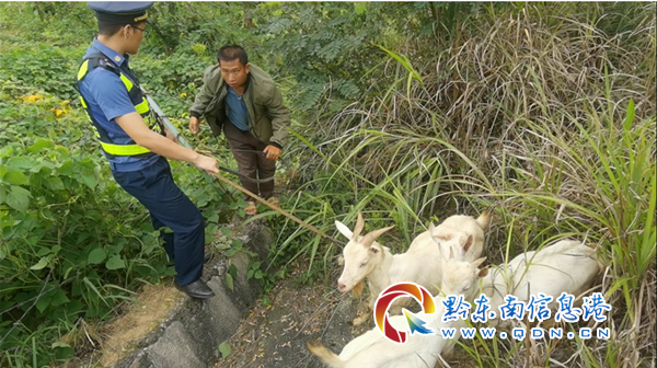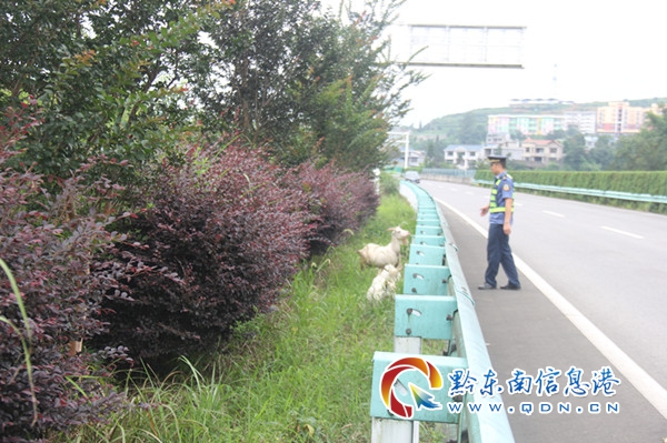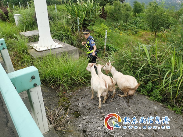 見況,路政員立即將執法車輛停放至應急車道上,人員分為兩組:一組在來車方向進行安全提示,示意車輛注意減速避讓;一組小心翼翼地當起“趕羊人”,將羊群趕離高速公路,及時消除了高速公路交通安全隱患。
