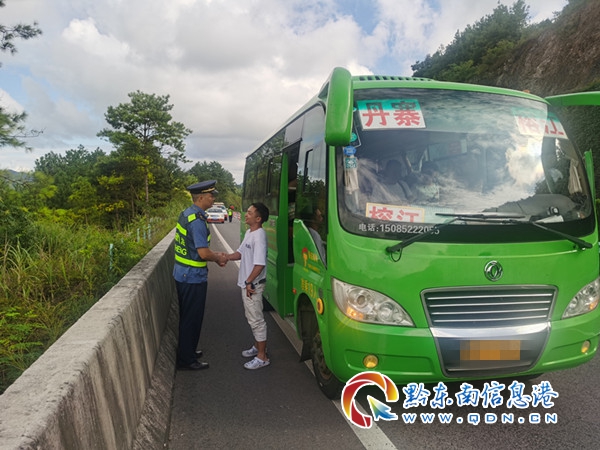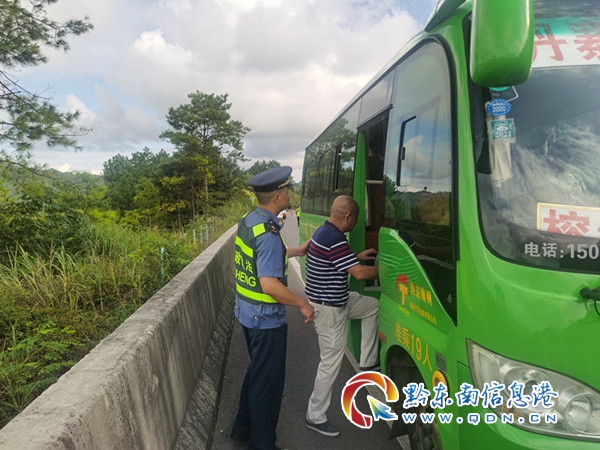 9月8日15時01分,凱里高速公路管理處丹寨路政執法大隊路政員驅車巡查至S62余冊高速K141+000下行時,發現一輛客運車開著危險警報閃光燈停靠在應急車道上,應急車道上還站著許多人,身邊車輛高速行駛而過,情況十分危險,路政員立即上前將行人勸離安全位置并了解情況。