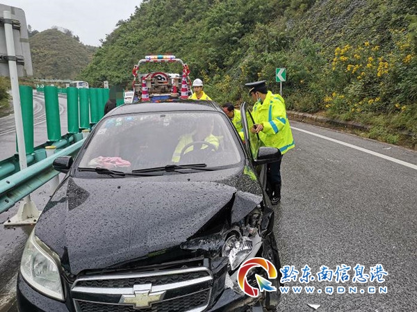 經路政員了解,司機攜同一家四口從凱里前往三都縣,途經K89互通匝道時,未能提前減速,加上天降大雨,路面濕滑,撞向高速公路左側護欄后向前滑行甩尾 " 逆行 " 停了下來,由于事故發生時一家人都系好了安全帶,在本次事故中一家四口都均未受傷,司機第一時間將家人轉移到高速公路護欄外并在車后150米擺放了三角警示標,同時撥打了12328救援電話。經過10分鐘的緊張救援,事故車輛被安全拖走,事故處理完畢。