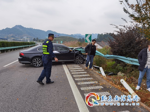 本網訊 10月26日12時05分,S62余冊高速凱里往丹寨方向(丹寨境內)一輛小轎車操作不當,車輛撞上護欄橫在高速公路上,所幸車上人員并未受傷。