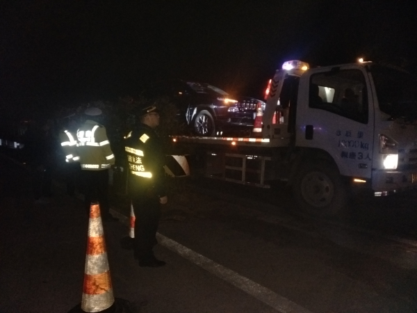 到達(dá)現(xiàn)場后,路政員發(fā)現(xiàn)兩輛事故車輛停在道路中央,而此路段正處于施工借道單幅通行的特殊路段,來去方向的車輛使用一條用交通警示柱隔離的通行車道,十分危險。為確保道路安全暢通,路政員立即組織應(yīng)急援救工作。一方面通知高速交警部門對后方車輛進(jìn)行交通管制,將凱里至黃平方向行駛的車輛分流至重安收費(fèi)站出站,避免發(fā)生“二次事故”,另一方面路政員立即通知應(yīng)急救援中隊派拖車前來救援。經(jīng)過一個半小時的緊張救援,成功將事故車輛安全拖離高速公路,恢復(fù)現(xiàn)場正常交通。