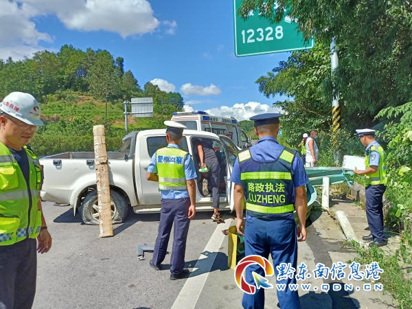 本網訊 2020年8月3日15時35分許,凱里高速公路管理處黃平路政執法大隊接高速公路救援電話12328報警稱:“有駕駛員報警,S62余安高速K25+000下行(黃平往余慶方向),一型小貨車撞到右側護欄上,車頭受損嚴重”,接警后路政員立即火速趕往現場,同時聯系轄區“一路三方”相關單位前往現場救援。