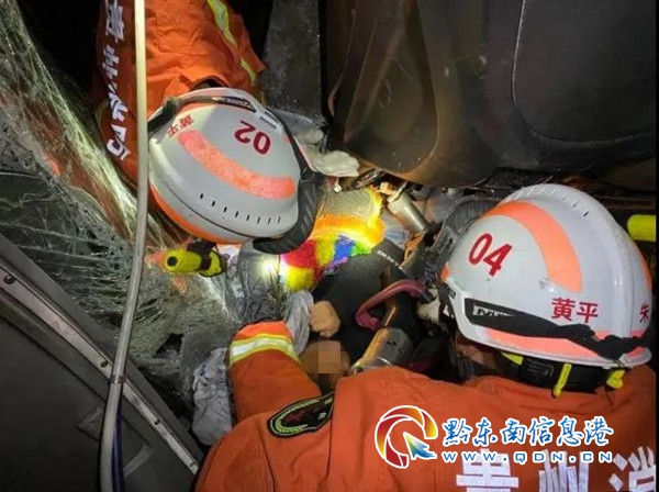 事故地點距離黃平縣城約45公里,救援人員到達現場后發現,砂石運載車位于道路拐彎處發生側翻,駕駛室嚴重變形,駕駛員左臂及雙腿被死死卡住,施救空間非常狹小。根據現場情況,指揮員周密部署作戰行動,充分利用現場救援裝備,使用撐頂、破拆、擴張、牽引等技戰術,有效擴展了被困者左臂、右腿、左腿處的卡位空間,為順利營救奠定了基礎。
