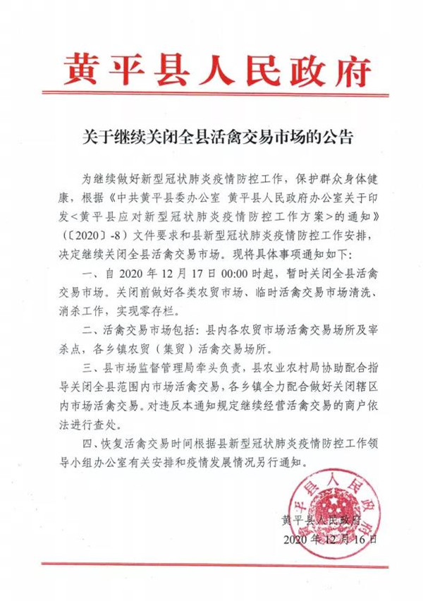 黔東南黃平縣關于繼續關閉全縣活禽交易市場的公告