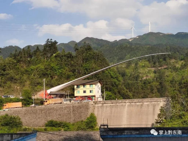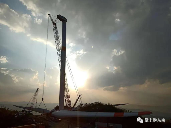5月5日下午,劍河縣久仰鎮(zhèn)風(fēng)力發(fā)電場內(nèi),多名技術(shù)人員正小心翼翼地控制著吊車,將68.8米長的風(fēng)力發(fā)電機(jī)葉片安裝至葉輪上。