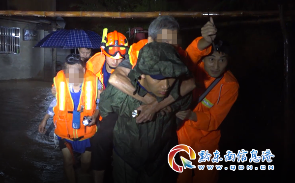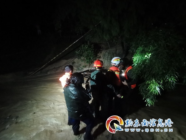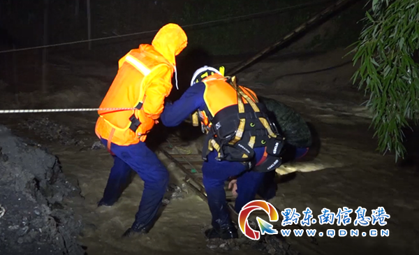當(dāng)天2時(shí)04分,劍河縣仰阿莎消防救援站接到仰阿莎街道辦報(bào)警:川洞村突發(fā)山洪,有兩名老人被困。消防救援人員到達(dá)現(xiàn)場(chǎng)時(shí),當(dāng)?shù)乇┯耆缱ⅲ貏?shì)陡峭,湍急的水流中夾雜著砂石,進(jìn)村的道路被山洪阻斷。根據(jù)現(xiàn)場(chǎng)情況,消防救援人員立即作出救援方案:先利用現(xiàn)場(chǎng)的大樹(shù)和石柱作為支點(diǎn),架好安全繩,再利用二節(jié)拉梯搭橋渡過(guò)洪水路段到達(dá)被困人員房屋。此時(shí),被困人員房屋一樓已經(jīng)被淹沒(méi)至窗戶,消防救援人員從窗戶把老人扶出來(lái),為老人穿上救生衣,由于老人腿腳不便,消防人員將他們背到了安全地帶進(jìn)行安置。