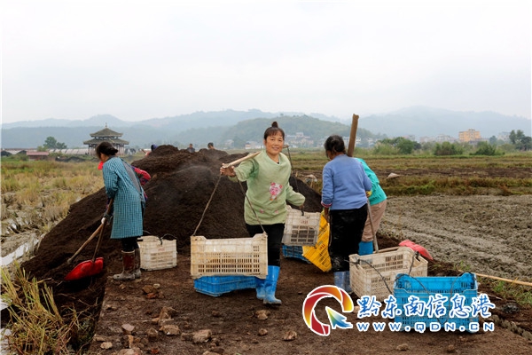 本網訊 10月9日,在錦屏縣銅鼓鎮花橋壩區大球蓋菇基地里,村民們正忙著松土、排溝、鋪放菌料、接種,大家各司其職,井然有序地開展大球蓋菇種植工作,呈現出一派繁忙景象。