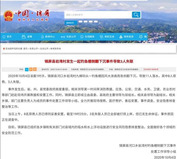 當日上午,8名獲救人員已得到妥善安置,截至19時25分,3名失聯(lián)人員已全部被打撈上岸,但已無生命體征。事件原因正在調查中。