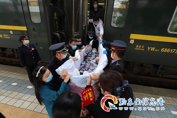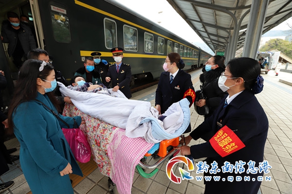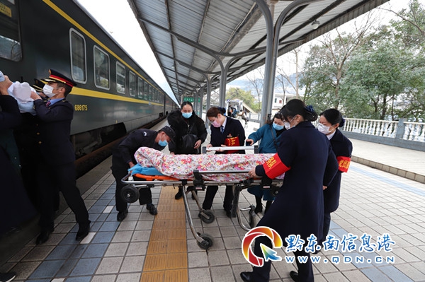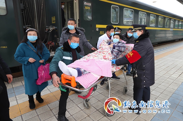 原來,當天11:20分,凱里站客運副站長劉曉梅接到一名旅客的救助電話。經了解,該旅客姓劉,其兒子劉某身患疾病,已經在北京醫院做完骨瘤手術,購買了從北京至貴陽Z161次列車的臥鋪席位車票,由4名親屬陪同出行,此行目的地是到達凱里站,再由救護車快速轉運至施秉縣人民醫院進行治療。