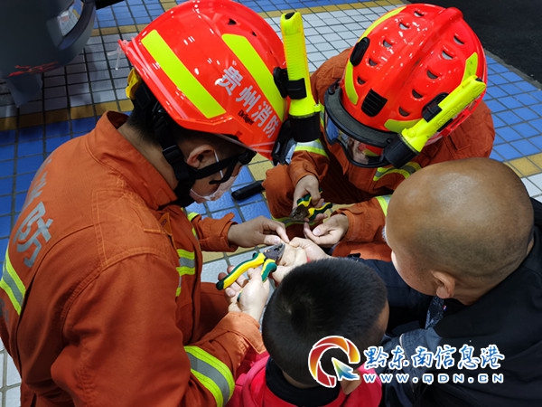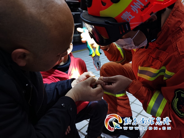 了解情況后,指揮員立即研究最佳救援方案,為保證人員手指不受到傷害,救援人員小心翼翼的用兩把鉗子對鐵環兩端進行拉扯,并一邊救援一邊安撫小孩情緒,小孩強忍著疼痛不出聲。經過短短幾分鐘,消防員成功將鐵環取下。當看到手上的鐵環被成功取下后,小孩和男子臉上都露出了欣喜的笑容,連連向消防員表示感謝。