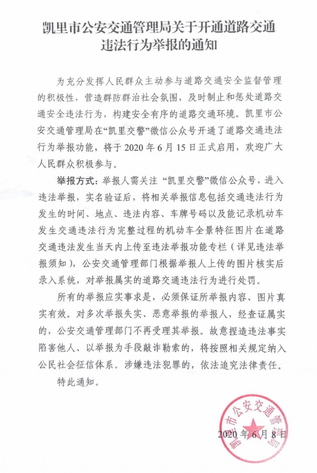 舉報方式:舉報人需關注 " 凱里交警 " 微信公眾號,進入違法舉報,實名驗證后,將相關舉報信息包括交通違法行為發(fā)生的時間、地點、違法內(nèi)容、車牌號碼以及能記錄機動車發(fā)生交通違法行為完整過程的機動車全景特征圖片在道路交通違法發(fā)生當天內(nèi)上傳至違法舉報功能專欄(詳見違法舉報須知),公安交通管理部門根據(jù)舉報人上傳的圖片核實后錄入系統(tǒng),對舉報屬實的道路交通違法行為進行處罰。
