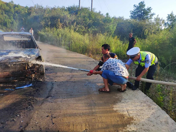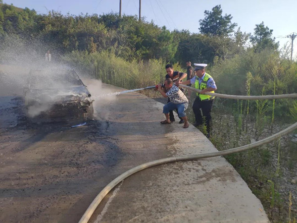 轄區交警及農村消防員相繼趕到現場,發現一輛紫色的轎車車頭正燃燒猛烈,火光四射,濃煙滾滾,車內無人員被困。轄區交警立即疏散周圍圍觀群眾,對道路實行臨時交通管制,并配合消防隊員用高壓水槍將自燃車輛撲滅。