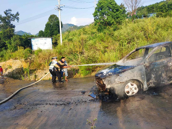 8月30日下午,凱里市公安局交警大隊爐碧片區中隊接到指揮中心指令稱,在爐山鎮蓮花塘路口處,一輛紫色的轎車發生自燃,火勢兇猛。接到指令后,轄區中隊交警迅速趕往現場處置。