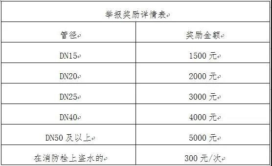舉報問題經查證屬實并被確認為第一舉報人的(第一舉報人,指同一舉報的問題經證實在此之前無他人舉報)可獲得獎勵。凡屬首次舉報上述各類盜水案件的,結案后,在五個工作日內給予舉報人獎勵。具體獎勵金額按舉報盜水管徑大小給予獎勵,獎勵標準如下: