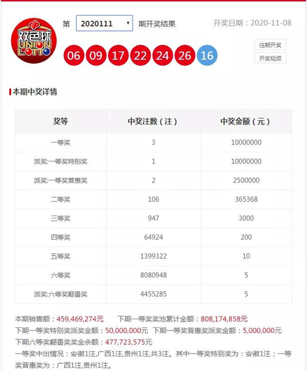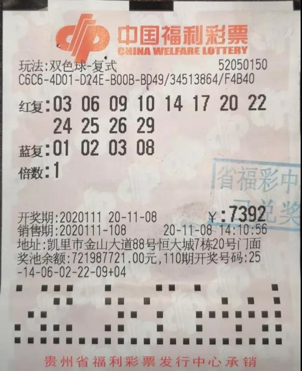 從網友提供的照片才了解到,11月8日,雙色球第2020111期開獎號碼為:06、09、17、22、24、26,藍號16。全國共中出雙色球一等獎3注,二等獎106注,其中的二等獎有4注花落凱里市金山大道88號恒大城7棟20號門面,中獲146萬。
