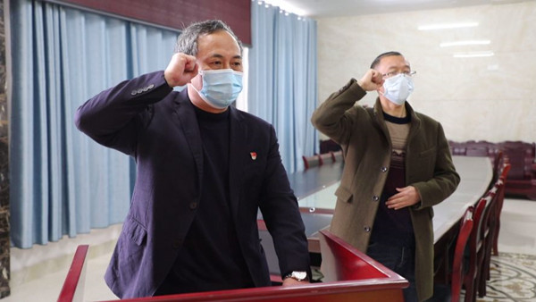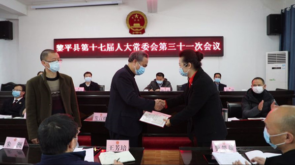 黎平縣人大常委會主任高凌平向兩位副縣長頒發任命證書