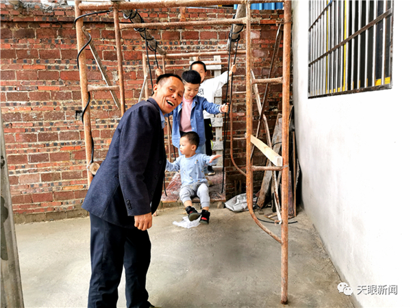 除了自制的滑滑梯外,老人還給兩個孫子做了一個秋千。