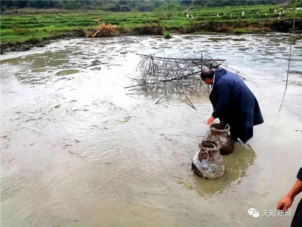 6日下午,雨稍微小了一點,硬核爺爺硬是拉著兒子田先生開車到五公里外的魚塘旁,冒著毛毛細雨把魚塘放干。