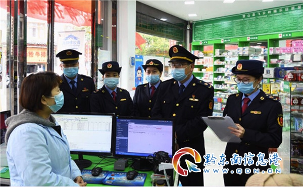 圖為陳歡歡(左三)與同事對藥店了解檢查防控物資場面。(楊華 攝影報道)
