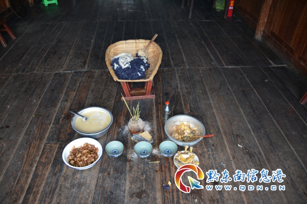 開秧門當天上午各家農戶用“五彩糯米飯”和豬、雞肉并燒香化紙祭祀的情景