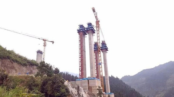 雷榕高速第四分部A6標烏鳥河大橋是全線十大控制性工程之一,也是全線跨度最大的剛構橋,其所處位置地形條件復雜,地勢陡峭,相對高差達到314.6米,橋面與烏鳥河相對高差140.5米。同時,此橋全長966.64米,最大跨度150米,各懸臂梁段采用掛籃懸臂澆筑和液壓爬模技術。