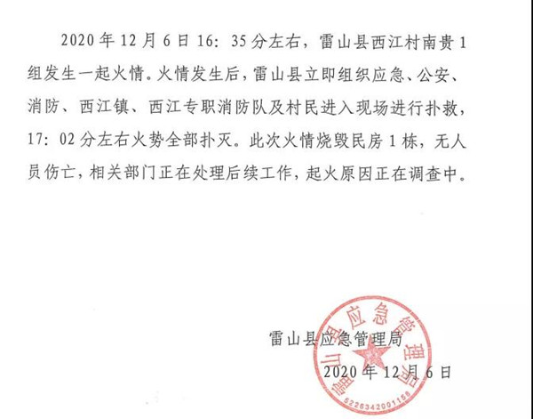 2020年12月6日16:35分左右,雷山縣西江村南貴1組發生一起火情。火情發生后,雷山縣立即組織應急、公安、消防、西江鎮、西江專職消防隊及村民進入現場進行撲救,17:02分左右火勢全部撲滅。此次火情燒毀民房1棟,無人員傷亡,相關部門正在處理后續工作,起火原因正在調查中。