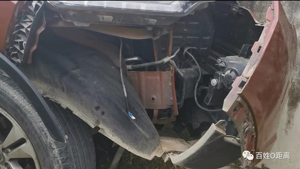 在現場,一輛橙色的越野車,直接撞在防護墻上,車頭嚴重變形,發動機已被撞報廢,車內安全氣囊全部彈出,從行車記錄儀看到,在事故發生時,車輛的車速并不快。但是在上坡后,不知道什么原因就直接往水泥擋墻上撞。