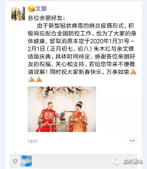 “從拍婚紗以及訂婚到現在快一年了,我們一直期待這一天的到來……,但是遇到了這個特殊時期,大家都在抗擊新型冠狀病毒,疫情嚴重,我們的責任也都挺重的,婚期延遲吧,等戰勝疫情我們的婚禮會更有意義,永遠愛你!”余文銀態度堅定與未婚妻聯系,未婚妻也很通情達理,相互理解,同意決定推遲。