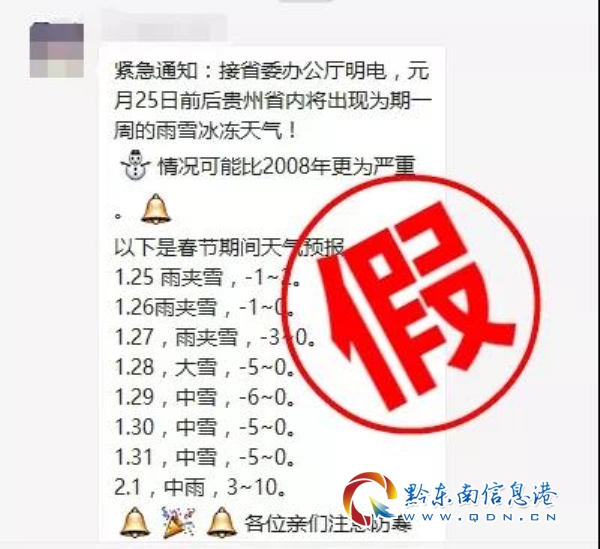 黔東南州氣象局辟謠說,這則信息經官方認定,是一則謠言!氣象部門提供的一個月趨勢預測,與謠言的預報大相徑庭,具體預報氣象部門會隨時跟進。一般會將提前7天的預報向公眾及時發布!旬、月報(10天、一個月)中長期預報僅作為決策服務向政府和相關部門服務。請大家不信謠、不傳謠!