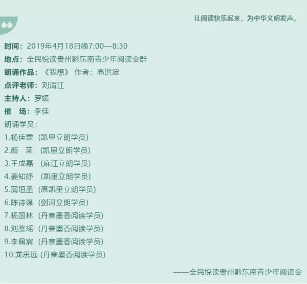 由立朗語言藝術(shù)培訓學校承辦的全民悅讀貴州黔東南青少年閱讀會群在2019年4月18日晚上7:00,全民悅讀貴州黔東南青少年閱讀會 “悅讀·悅生活”的微誦會正式拉開帷幕。