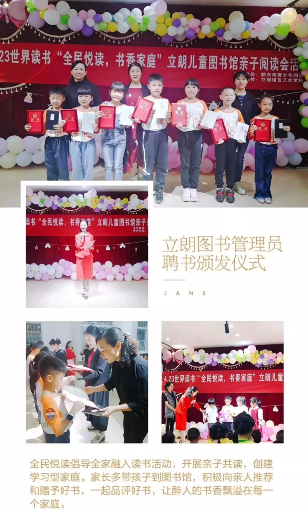 2019年4月23日晚上,由黔東南青少年閱讀會主辦、立朗語言藝術(shù)培訓學校協(xié)辦的4.23世界讀書“全民悅讀,書香家庭”立朗兒童圖書館親子閱讀會活動,黔東南州青少年閱讀會主席楊俊榮、秘書長羅媛等老師參與此次活動。