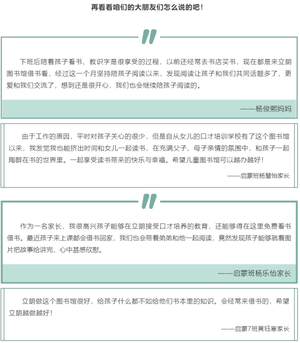自立朗兒童圖書館開館以來,收到了許多家長們的評價,您們的支持就是我們前進的動力!