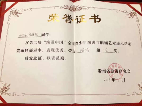 立朗少年劉彥君、李曦然參加第二屆“演說中國”全國青少年演講與朗誦藝術(shù)展示活動貴州區(qū)展示中榮獲朗誦組金獎。