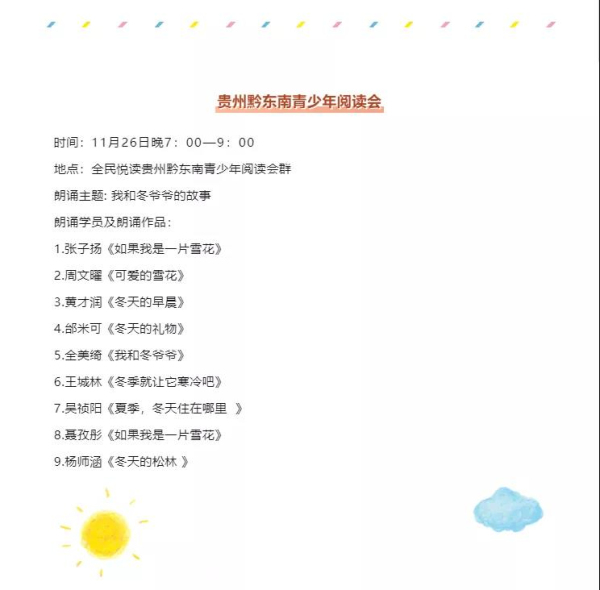 來自立朗劍河校區(qū)的全民悅讀貴州黔東南青少年閱讀會會員開展了11月“我和冬爺爺?shù)墓适?rdquo;線上閱讀活動。