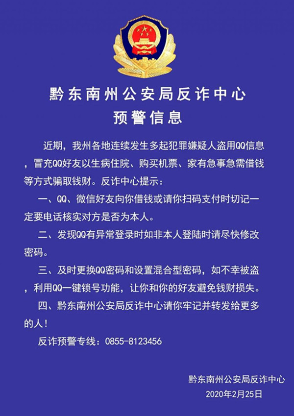 黔東南州各地連續發生多起盜用冒充 QQ 好友借錢騙取錢財