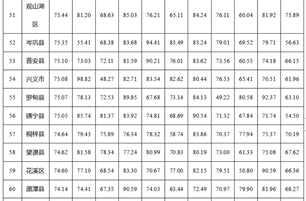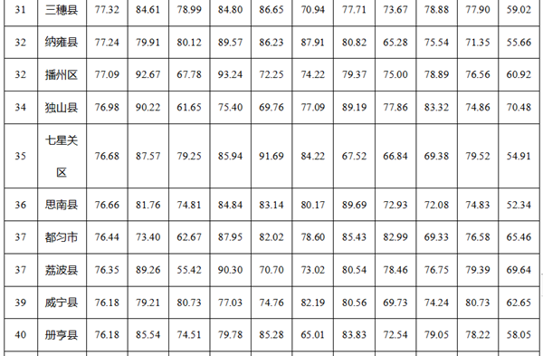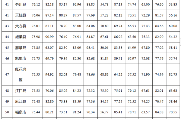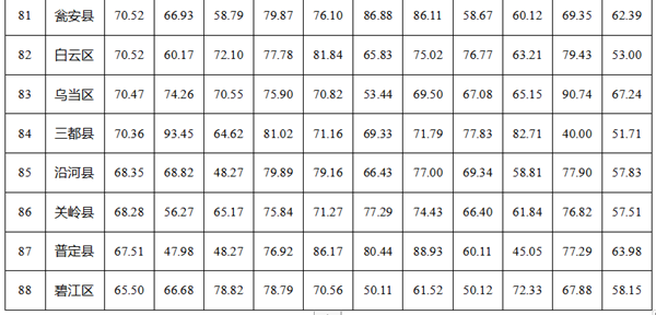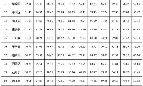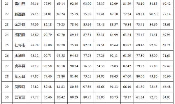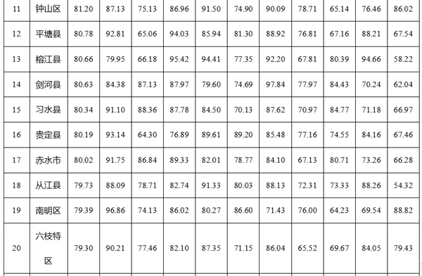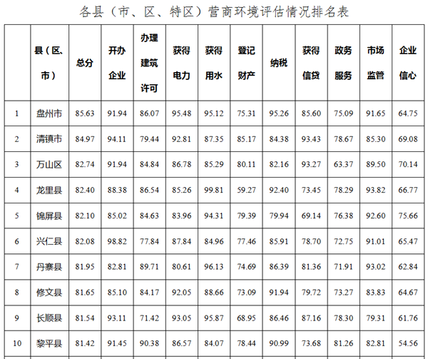 市(州)、貴安新區(qū),縣(市、區(qū)、特區(qū))的考核評估,由貴州財經(jīng)大學(xué)就全省貫徹落實《貴州省營商環(huán)境優(yōu)化提升工作方案》情況走訪調(diào)研了88個縣(市、區(qū)、特區(qū))的中小企業(yè)、政府機構(gòu)、中介機構(gòu),并采集相關(guān)數(shù)據(jù)分析,最終獲得市(州)、貴安新區(qū),各縣(市、區(qū)、特區(qū))的營商環(huán)境便利度分數(shù)。其中市(州)、貴安新區(qū)排名:貴陽市為第一名,安順市為最后一名;縣(市、區(qū)、特區(qū))排名:前5位分別是盤州市、清鎮(zhèn)市、萬山區(qū)、龍里縣、錦屏縣,后5位分別是三都縣、沿河縣、關(guān)嶺縣、普定縣、碧江區(qū)。