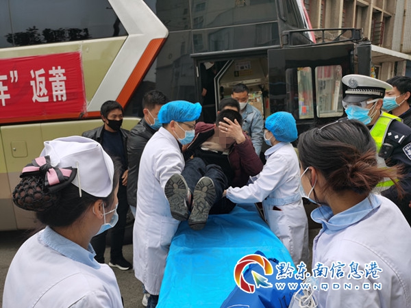 客車到達麻江服務區后,民警隨即上車查看情況,在客車的狹窄的過道上,一名三十多歲的男子平躺著,精神狀態十分不好。駕駛員對民警說,自己已經聯系120急救車。民警根據當時高速公路上車流緩行的情況判斷,救護車趕到現場,至少要40分鐘左右。民警當即決定用警車開道,一路將大巴車護送到麻江縣人民醫院。