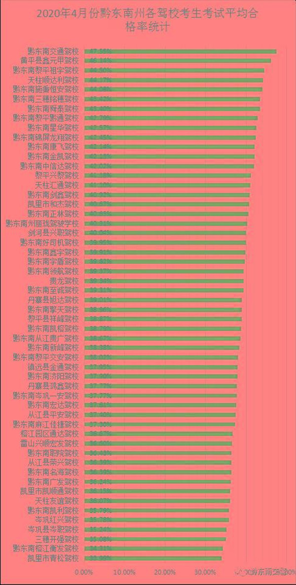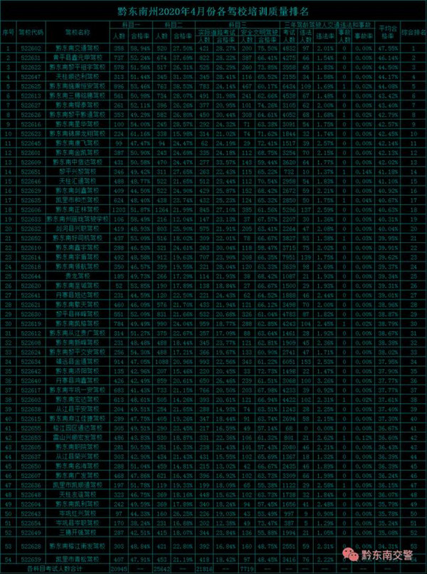 全州機動車駕駛培訓機構4月份考試平均合格率排名前三的是:黔東南交通駕校47.55%、黃平縣鑫元甲駕校46.14%、黔東南黎平祖宇駕校44.50%;排名后三的是:三穗開強駕校35.08%、黔東南榕江衡發駕校34.31%、凱里市青松駕校33.99%。