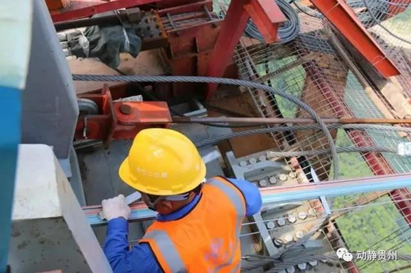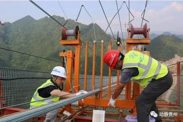 “AS法是利用牽引機械往復拽拉平行高強鍍鋅鋼絲,在現場制作平行鋼絲索股,該工藝可以廣泛運用到運輸條件差的山區和超大跨徑懸索橋的建設中,對貴州山區來說,AS法就是量身定做。”貴黃項目經理楊博介紹道。