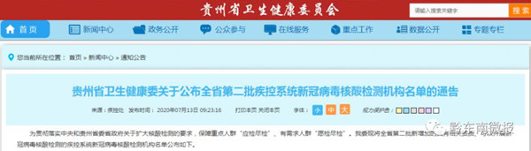 7 月 9 日,貴州省衛(wèi)生健康委公布了第二批具備新冠病毒核酸檢測資質(zhì)醫(yī)療機構(gòu)名單。