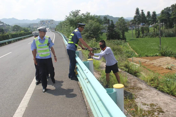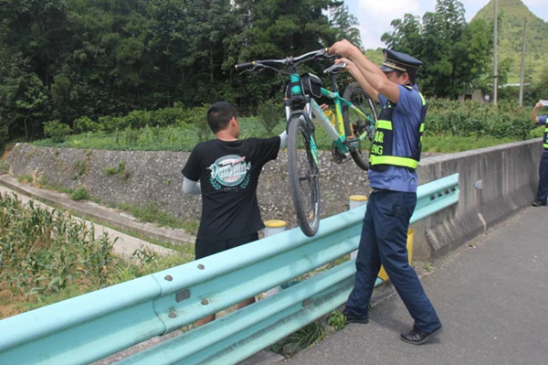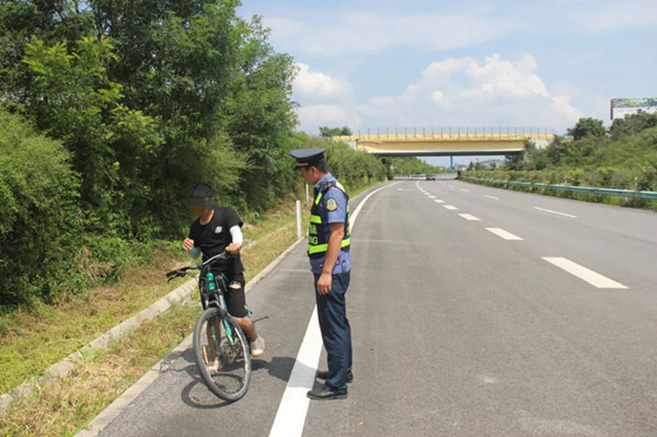 到達現場時,路政員看到一名騎自行車的年輕人正在應急車道上騎行,此時過往車輛較多,不時從旁邊呼嘯而過,情況非常危急。路政員急忙打開雙閃、拉響警笛在騎行者后方護送,并利用喊話器示意騎行者靠邊安全停車。自行車安全停車后,路政員還發(fā)現前方還有一名同行的騎行者,此時已被“一路三方”其他單位工作人員安全攔停。
