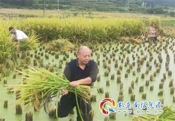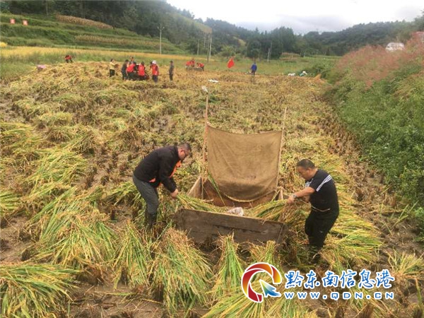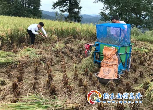 在錦屏縣敦寨鎮(zhèn)羅丹村,郵政駐村干部向達(dá)昌同其他駐村干部一起來(lái)到貧困戶的田里搶收稻谷。