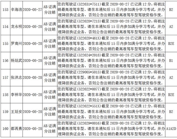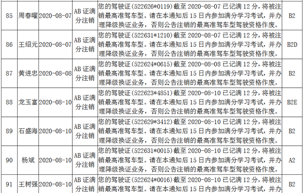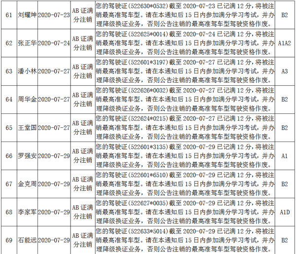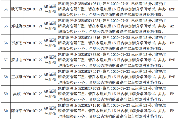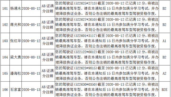 根據《機動車駕駛證申領和使用規定》(公安部令第139號)第七十八條規定持有大型客車、牽引車、城市公交車、中型客車、大型貨車駕駛證的駕駛人有在一個記分周期內有記滿12分記錄的,車輛管理所應當注銷其最高準駕車型駕駛資格。下列駕駛員因在一個記分周期內有記滿12分記錄,最高準駕車型駕駛資格被注銷,現予以公告: