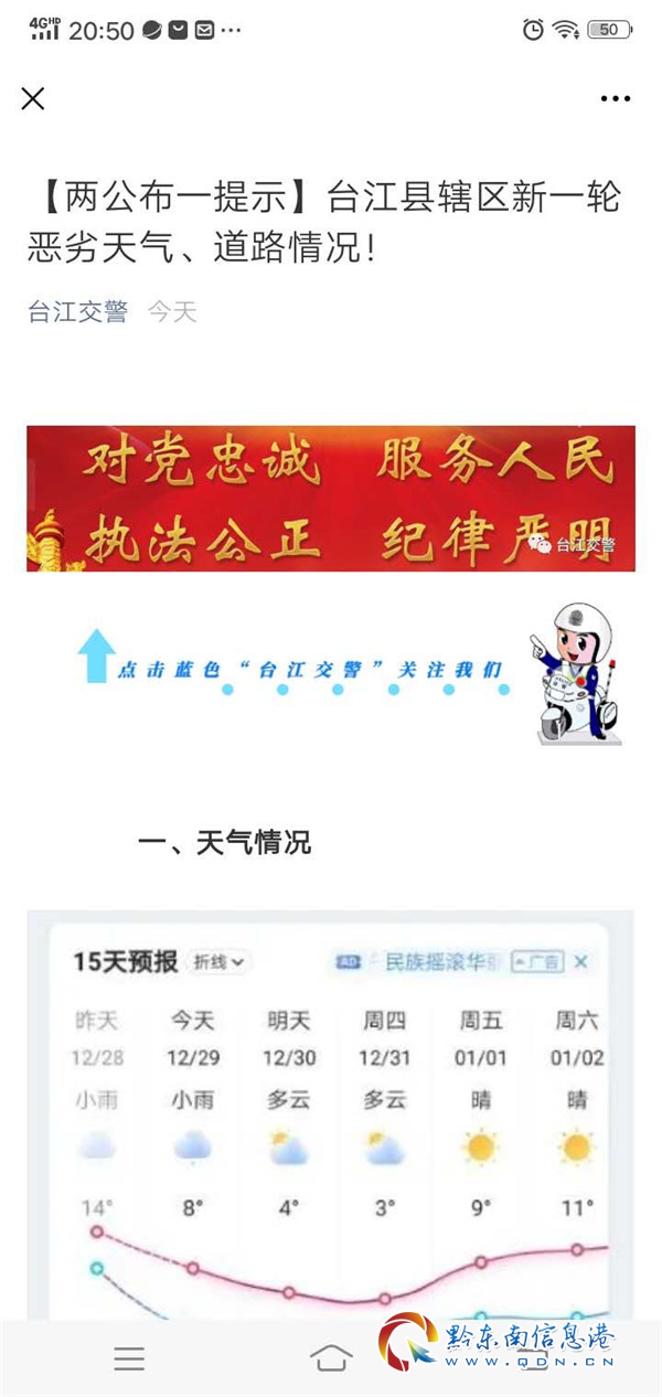 本網訊 根據中央氣象臺發布今冬首個最高寒潮橙色預警,貴州省和黔東南州氣象預報,2020年12月28日晚開始,黔東南州出現寒潮天氣,高海拔地區有凍雨和雨夾雪,日最低氣溫-4至0℃,部分路段伴有道路結冰,且局地有霧。12月28日,黔東南州公安局交警支隊啟動一級勤務,全面進入戰時狀態,一律取消休假休息,全員在崗在位,全力做好第二輪雨雪凝凍惡劣氣候道路交通安全保暢工作。