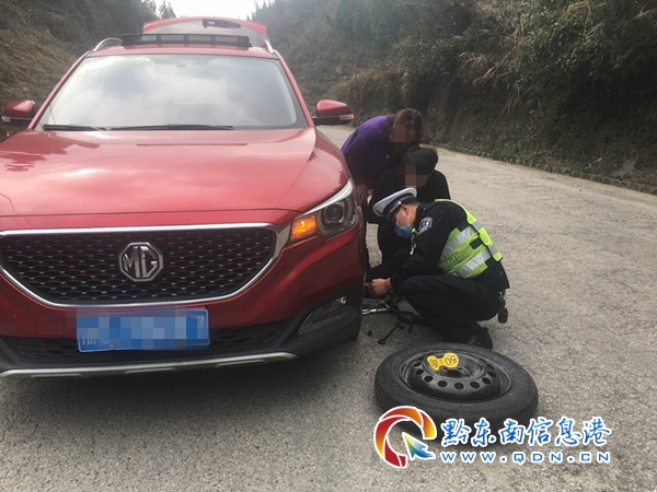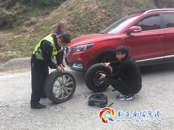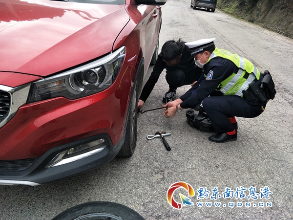 這時,施秉縣公安局交警大隊民警恰好巡邏至此,發現了這個彎道停車的安全隱患,立即到他跟前詢問具體情況。得知王某準備返回浙江上班,但不料發生爆胎拋錨在這里,突發狀況讓他已經不知所措。民警在后方設置了安全防護,便指導王某拿出隨車工具,只用幾分鐘就幫助王某更換好了輪胎。