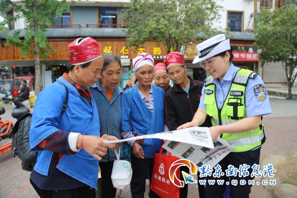 活動現場,民警不斷為過往行人送上宣傳資料,積極解答關于道路交通安全知識的咨詢。當苗族同胞來到宣傳臺前時,民警即靈活利用苗族語言進行宣講,全方位、多角度講解交通安全法規,分析交通違法的嚴重危害,請大家一定要安全文明參與交通。