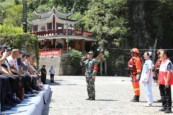 防汛綜合演練,針對汛期突發強降雨杉木河景區河水猛漲,突發險情,游客被困等事故特點,按事故的發現與報告、應急指揮與協調、現場救援等流程進行。演練內容涉及被困游客的搜救、搶救傷員演練、游客安全疏散、道路保障恢復、應急救援表演等內容,基本涵蓋了汛期極端天氣下應急救援處置的各個環節。