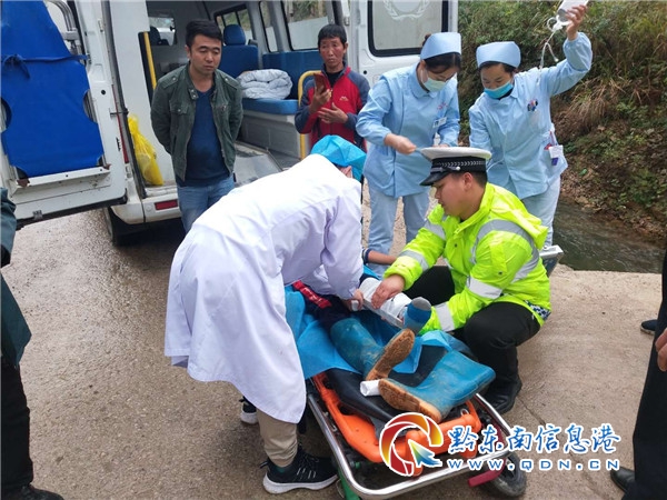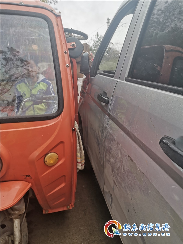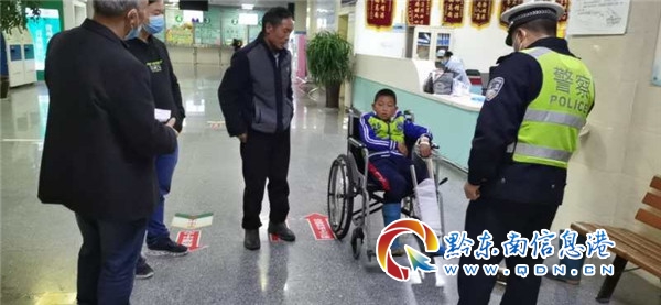 民警抵達事發現場,看到路面較窄的彎道處,一輛號牌為貴F5V7**輕型普通貨車和一輛號牌為貴HER7**三輪載貨摩托車碰在一起,三輪車上一個小孩子腳部被卡受傷,無法脫身。巡邏民警立即一邊了解情況、查看小孩受傷情況,一邊給予安撫、消除小孩的恐懼,同時撥打120急救電話,請求快速前往現場進行救援。